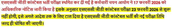 एसएससी जीडी यानी कर्मचारी चयन आयोग के द्वारा एसएससी जीडी भर्ती के लिए एग्जाम डेट घोषित कर दी गई है स्टाफ सिलेक्शन कमीशन की तरफ से यह परीक्षा तिथि घोषित की गई है जिसमें अलग-अलग पदों के लिए यह भर्ती आयोजित करवाई जाएगी एसएससी जीडी के लिए परीक्षा का आयोजन 23 फरवरी 2026 से नहीं होगी एसएससी जीडी के लिए एग्जाम डेट स्थगित कर दी गई है अब नए आदेश तक एक बार परीक्षा नहीं होगी।।
