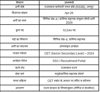 • राजस्थान एलडीसी लिपिक ग्रेड सेकंड कनिष्ठ सहायक संयुक्त सीधी भर्ती के लिए नोटिफिकेशन जारी कर दिया है इसके लिए सीनियर सेकेंडरी स्तर सम्मान पात्रता परीक्षा के आधार पर परीक्षा आयोजित करवाई जाएगी इसके अंदर जिन्होंने परीक्षा पास कर ली है वही इस परीक्षा में भाग ले सकेंगे यहां पर योग्यता 12वीं पास रखी गई है इसके लिए सभी अभ्यर्थी ऑनलाइन आवेदन फॉर्म भर सकते हैं आवेदन फॉर्म भरने के लिए अंतिम तिथि 13 फरवरी 2026 रखी गई है।